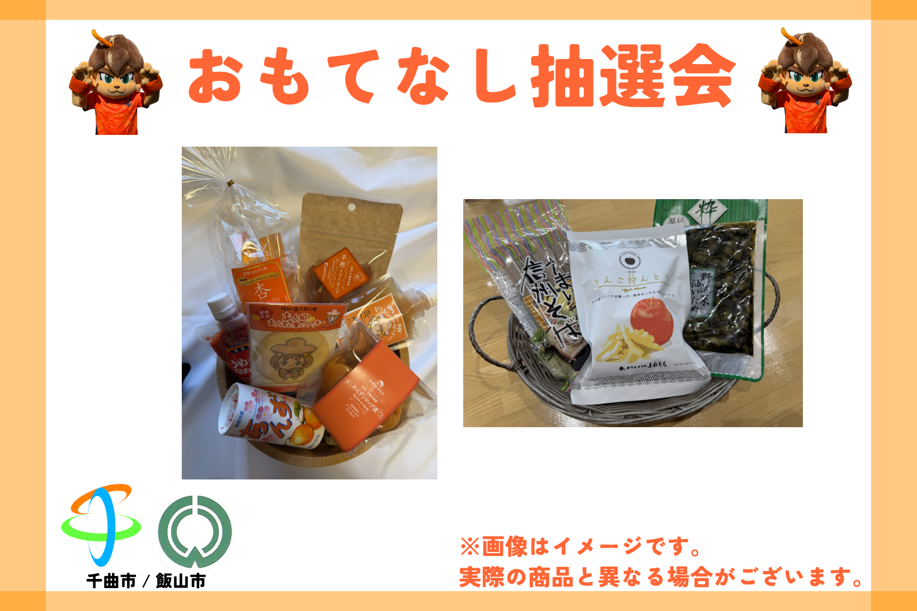 本節がホームタウンデーの、千曲市/飯山市様ご協力のもと、おもてなし抽選会を実施します!特産品詰め合わせセットが当たるチャンス!ぜひお楽しみください。