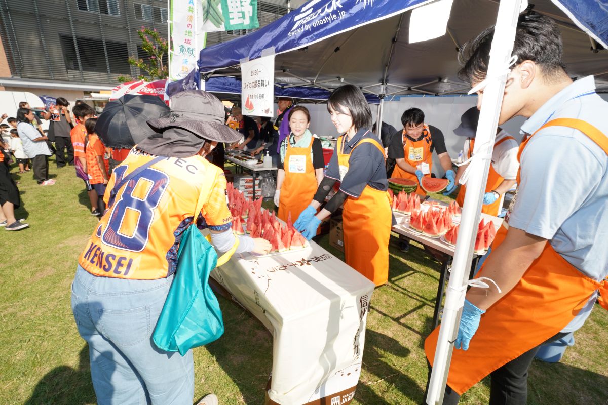 思い出の丘でも多くのイベントを実施しました。JAグリーン長野様による夏にぴったりのスイカや冷やしトマト&きゅうりの振る舞いがあり、多くのお客様に大変喜んでいただきました。また、須坂コルツ様による元気いっぱいのチアパフォーマンスも披露され、会場は大きな盛り上がりを見せました。暑さを吹き飛ばすような賑わいの中で、思い出に残るひとときをお届けすることができました。