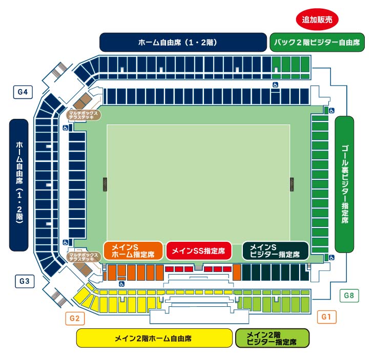 ・メインスタンド指定席、自由席はホーム・アウェイ両チームそれぞれのユニフォームやグッズ等を身に着けての応援・観戦が可能です。