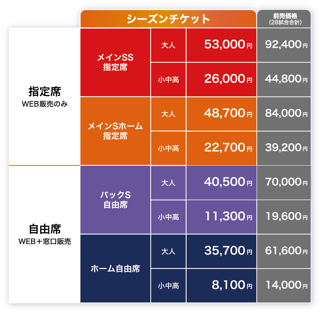 来季は単券の席割変更に伴い、シーズンチケットの席割も変更させていただきます。また、シーズンチケット単体でのご購入が可能となります。シーズンチケットは、前売価格よりおおよそ40%OFFでご購入いただける大変お得なチケットです。
