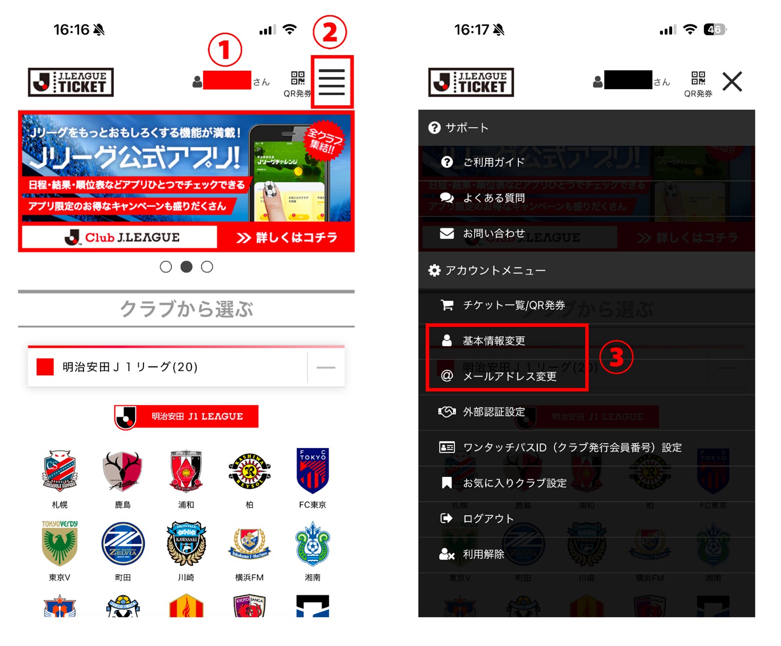 ①JリーグチケットよりJリーグIDでログイン、氏名が表示されればログイン完了です。 https://www.jleague-ticket.jp/