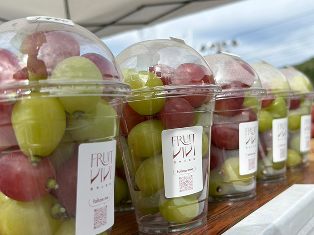 須坂高甫地域で丁寧に育てたこだわりの「樹成り完熟ぶどう」クイーンルージュ®&シャインマスカットをセットで、採れたてを粒切りにしてご提供いたします。