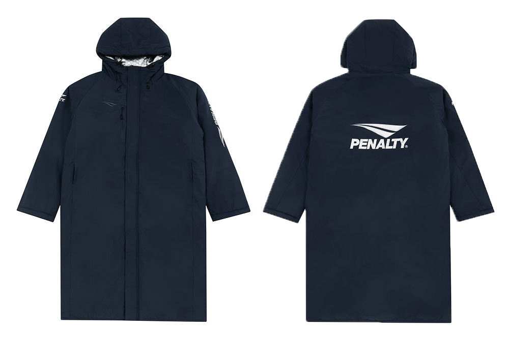 背面とアーム部分にブランドロゴを配したスタンダードなデザインのロングコートです。
