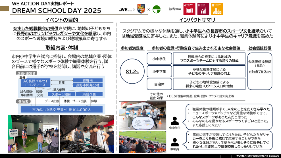 このたび、AC長野パルセイロ・レディースでは、「女子サッカー・スポーツを通じて、夢や生き方の多様性にあふれ、 一人ひとりが輝く社会の実現・発展に貢献する」というWEリーグ理念推進活動としての「WE ACTION DAY」を実施しましたので、ご報告いたします。