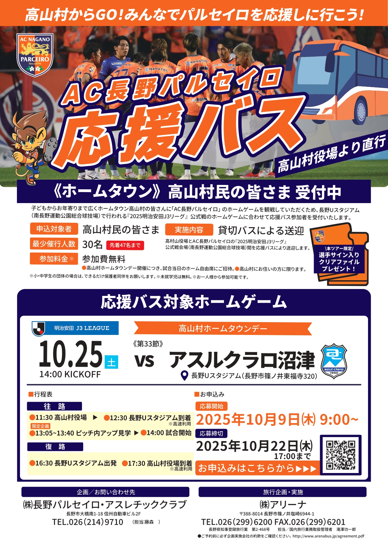 本企画は、子どもからお年寄りまで幅広い世代の皆さまに、ホームタウンである高山村からAC長野パルセイロのホームゲームを観戦していただくことを目的に、高山村役場のご協力のもと応援バスツアーを実施いたします。
