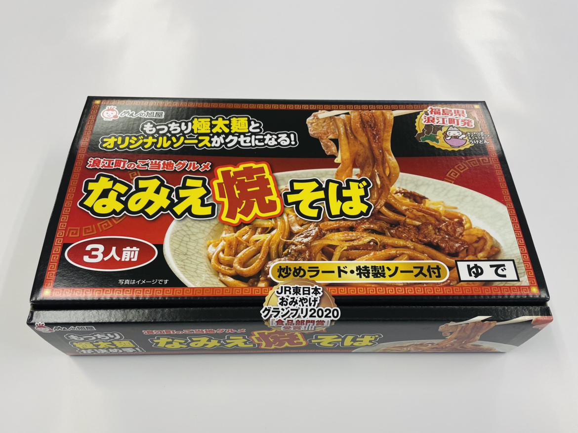 浪江町のご当地グルメ「なみえ焼そば」の3食ギフトセット。通常の麺の約3倍太い、モッチリした極太麺を使用。こってりしたオリジナルソースがクセになります。