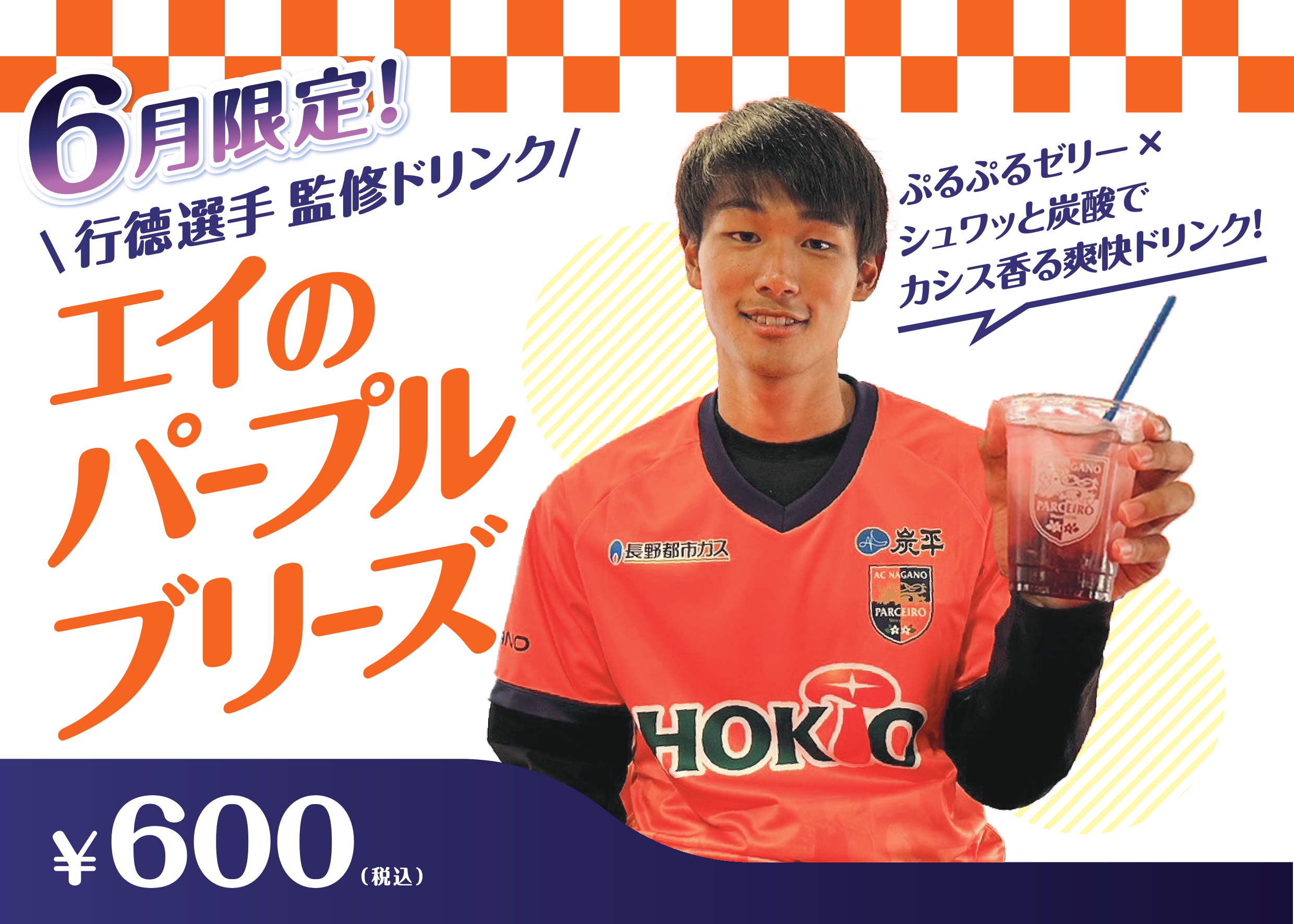 6月に販売して大好評でした、行德瑛選手が監修した【エイのパープルブリーズ】を八戸戦では復活販売します!ゼリーと炭酸がシュワっと弾ける、カシス香る爽やかなドリンクです。