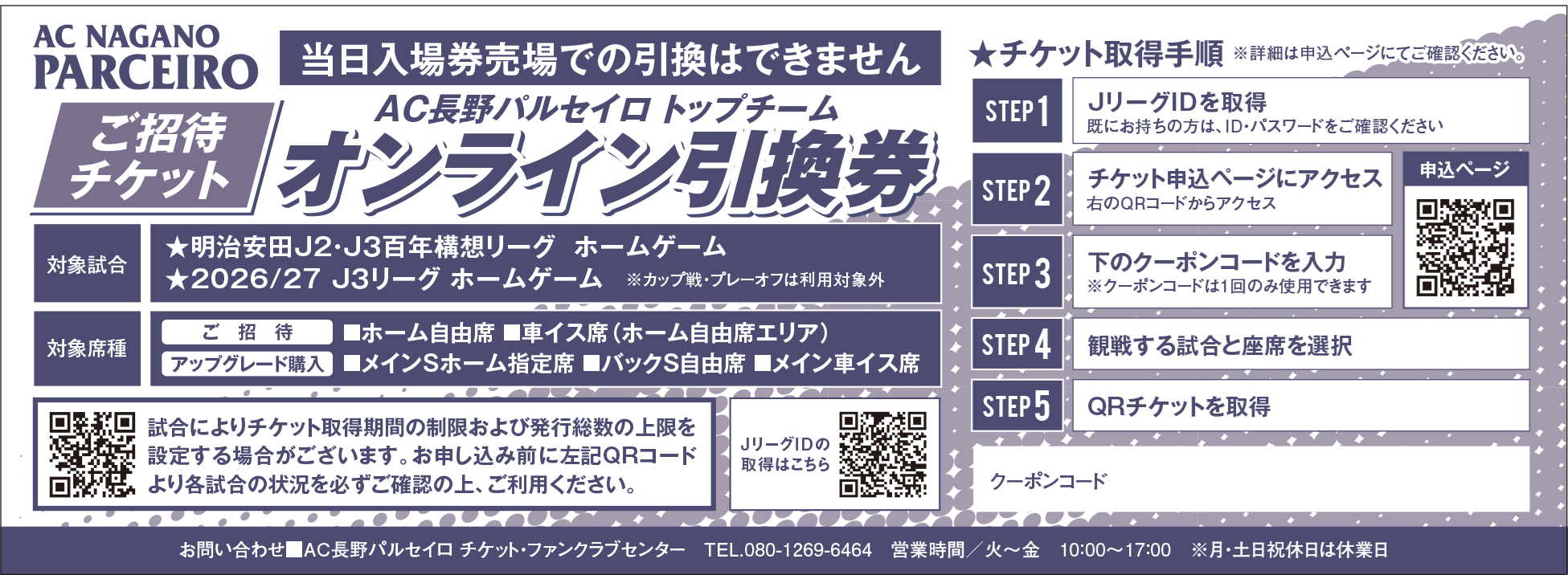 2026/2027シーズンのAC長野パルセイロトップチームホームゲームにおいて、下記の引換券をお持ちの方はJリーグチケット(オンライン)でお手続きいただくと、無料招待チケットを取得いただけます。チケット申込(取得)方法、対象試合・席種は引換券の券面または申込ページにてご確認ください。