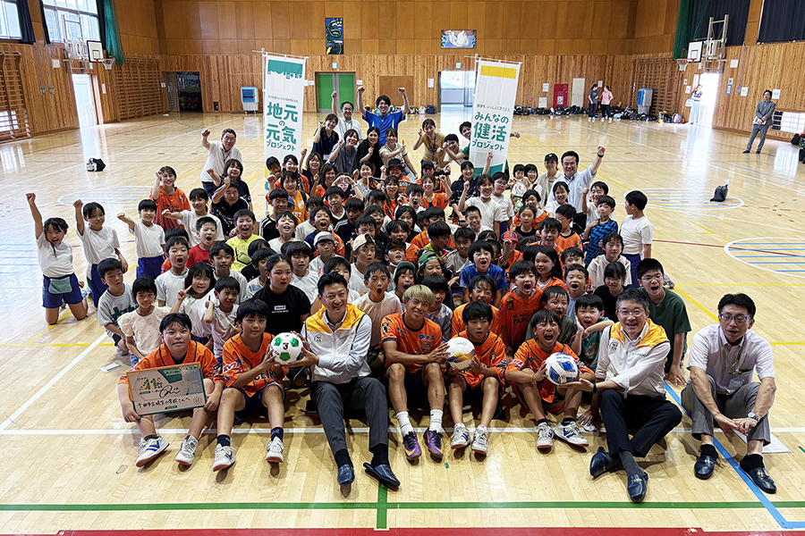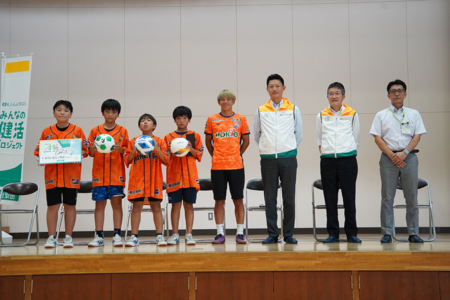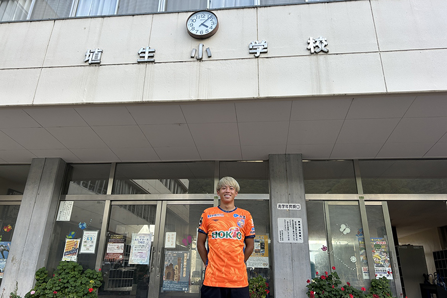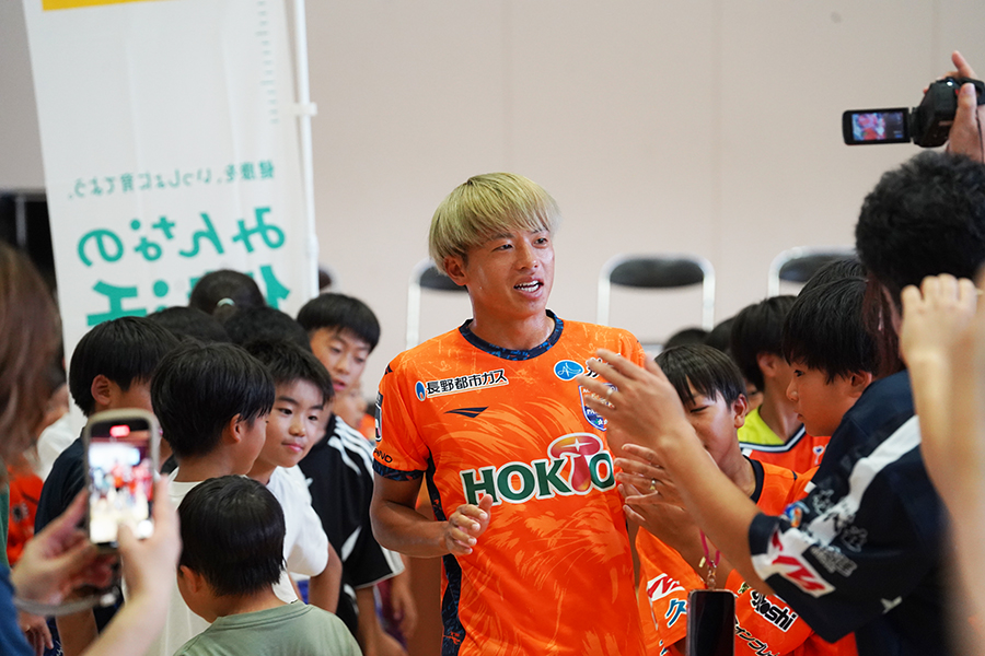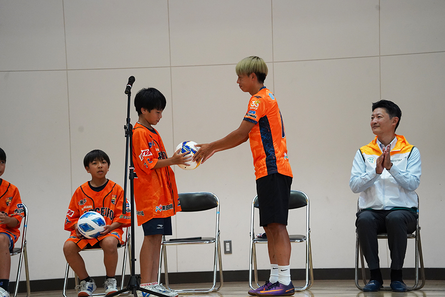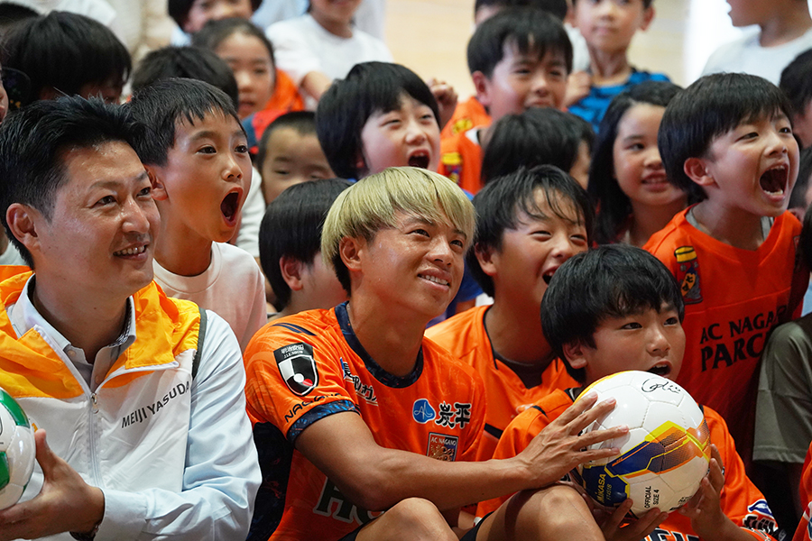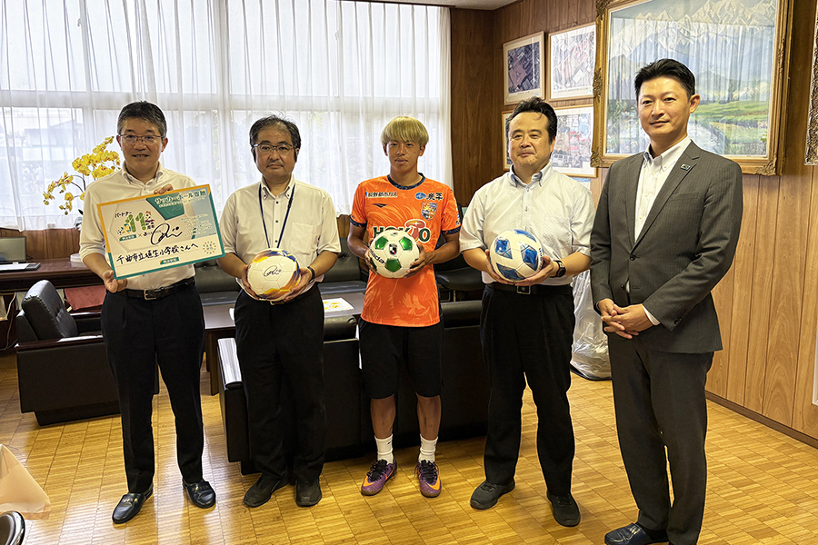 先日、トップチームから卒業生の山中麗央選手が母校の千曲市立埴生小学校を訪問し直接子ども達にボールを寄贈いたしました。