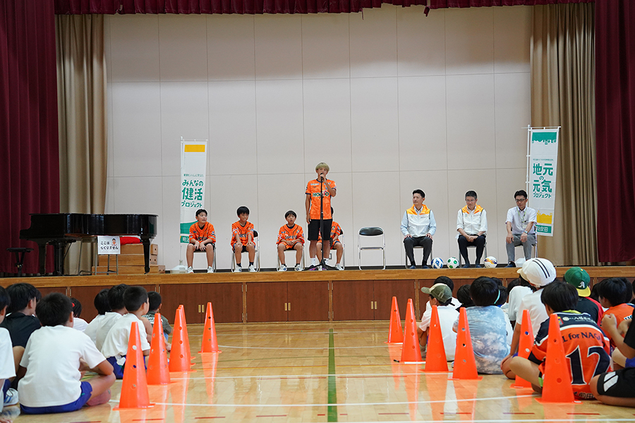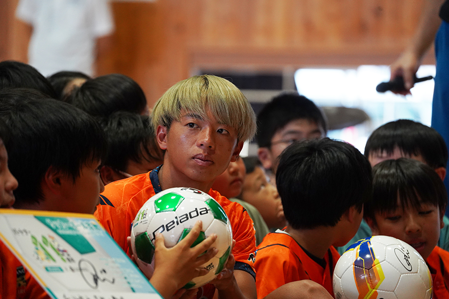 山中選手から児童へ「小学生の頃からプロを目指していました。学校の休み時間はいつも友達とサッカーをしていました。夢や目標を見つけて充実した日々を送ってほしい」とメッセージを述べました。