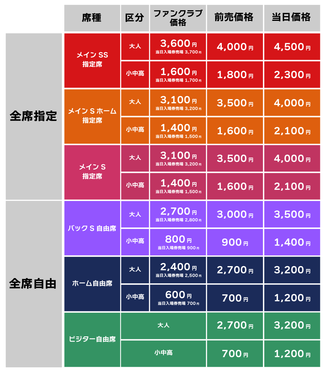 ・その他の席種は通常価格より+500円、小中高+200円となります。