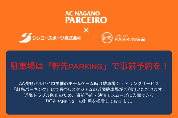 AC長野パルセイロ主催のホームゲーム時は駐車場シェアリングサービス『軒先パーキング』にて長野Uスタジアムの近隣駐車場がご利用いただけます。