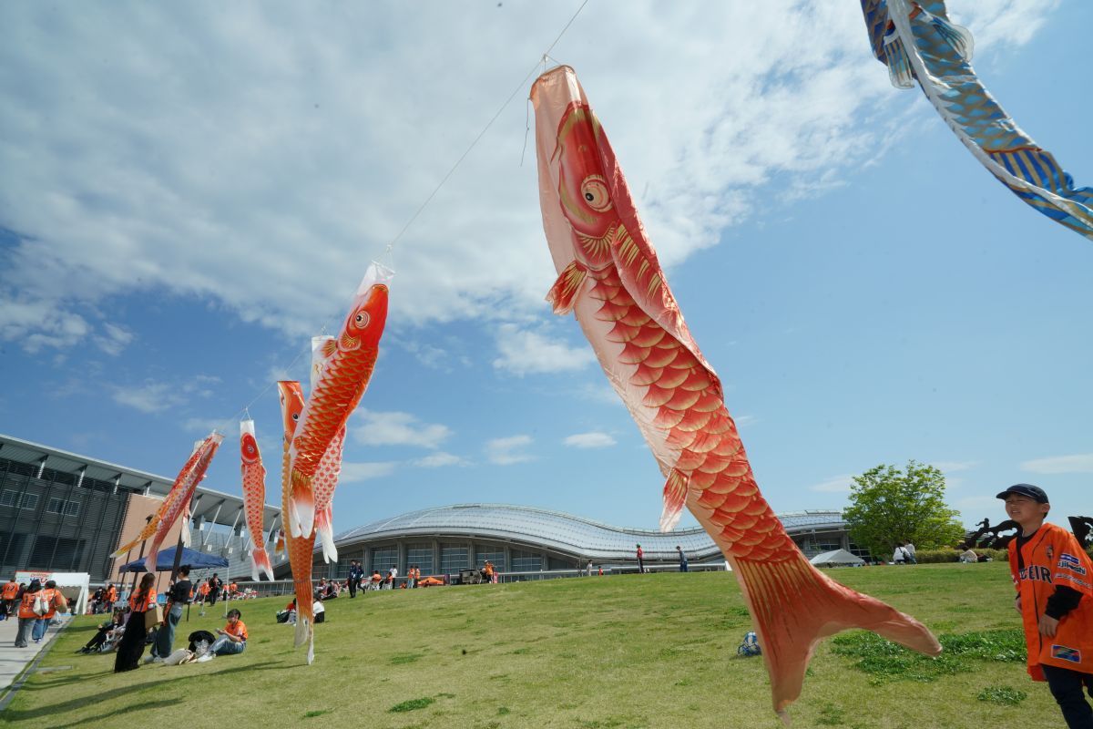 「鯉のぼりイレブン」が長野Uスタジアムに登場!11匹の鯉のぼりを掲出します。それぞれ個性豊かな鯉のぼりたちが、皆さんを元気にお出迎えします!