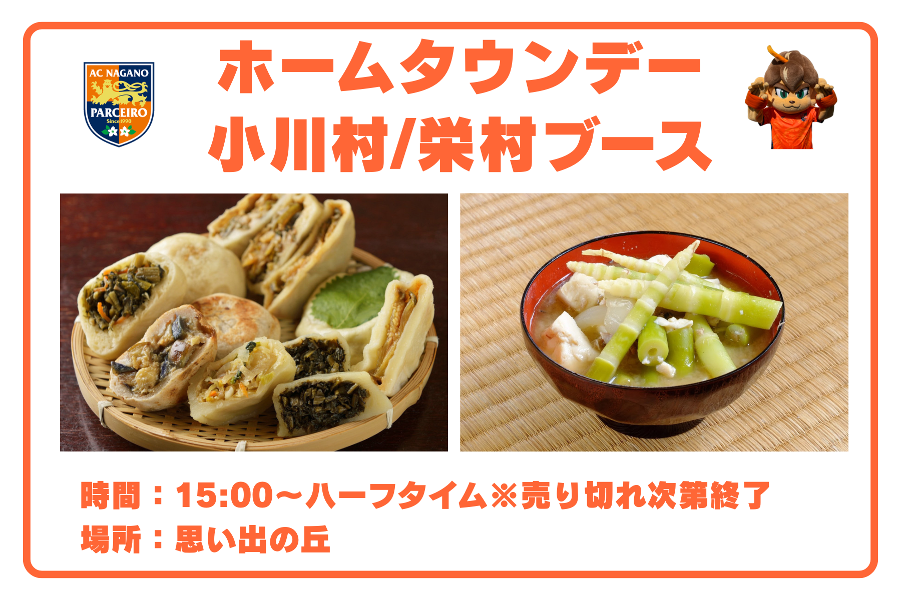 ホームタウン小川村、栄村の特産品販売ブースが出店!おやきや竹の子汁を販売します!ぜひお立ち寄りください。詳細はこちら