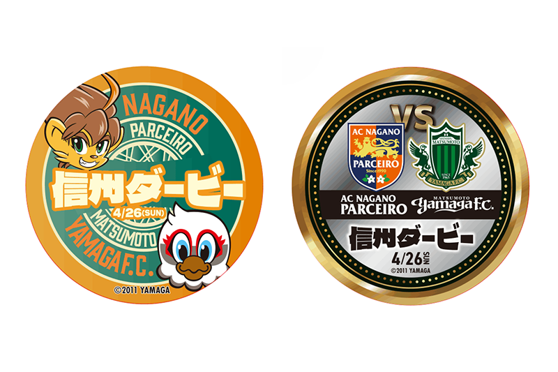 松本山雅FCとのコラボグッズです。両チームのエンブレムやマスコットがデザインされたマッチデー缶バッジです。