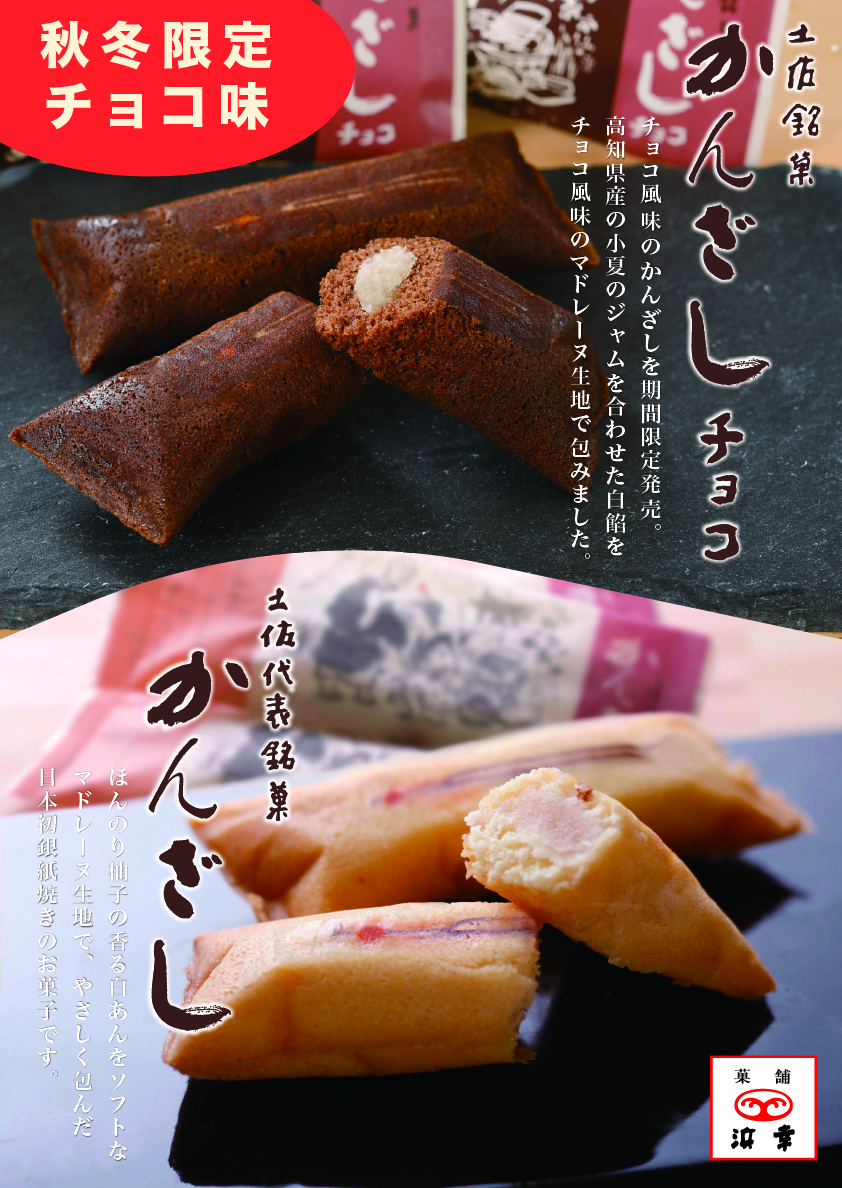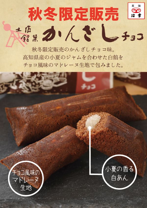秋冬限定復活!土佐銘菓かんざしのチョコバージョン。高知県産小夏ジャムが入った白餡でしっとりさわやか。
