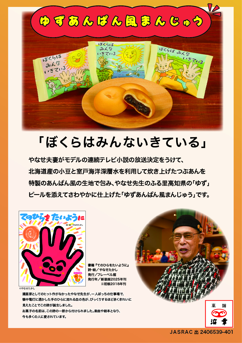 やなせたかし先生ゆかりの地、高知県産の「ゆず」を使い、さわやかなゆずあんぱん風のおまんじゅうです。