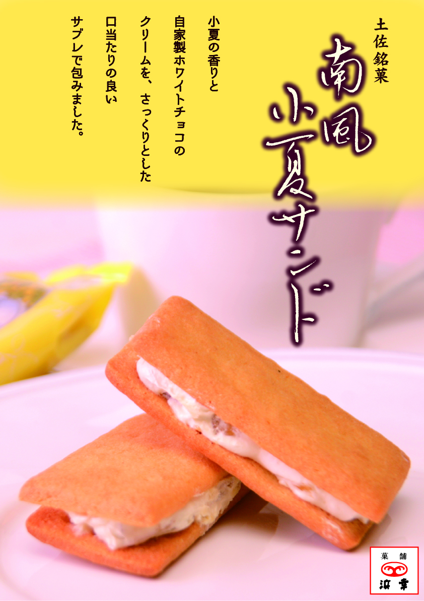 土佐の自然の息吹そのまま、小夏のピールの入った薄味のホワイトチョコレートを使って、甘酸っぱくさわやかな香り高い小夏サンドに仕上げました。