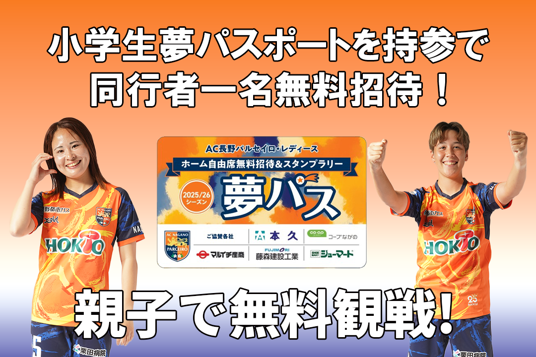 9/14(日)ジェフ千葉レディース戦は夢パスポートで応援に行こう!9月14日(日)2025/26 SOMPO WEリーグ第6節 vs ジェフ千葉レディース戦に小学生夢パスポートをお持ちいただくと、同伴者1名様にホーム自由席のチケットをプレゼント!チケット券売所で夢パスポートをお見せください!