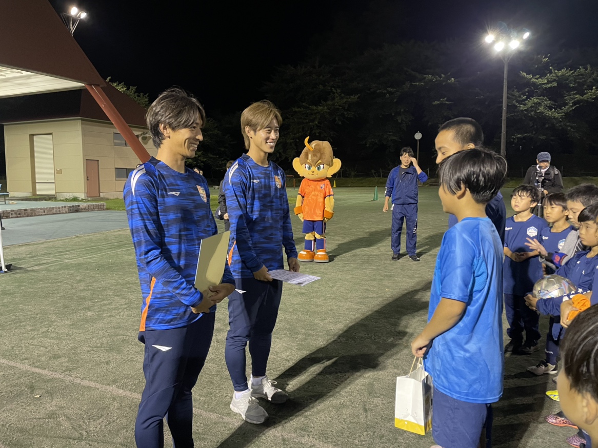 10月8日(水)、山ノ内町ホームタウンパートナープレーヤーの藤森亮志選手、安藤一哉選手とライオーが、山ノ内町やまびこ広場を訪問し、山ノ内FCの子どもたちと交流を行いました。