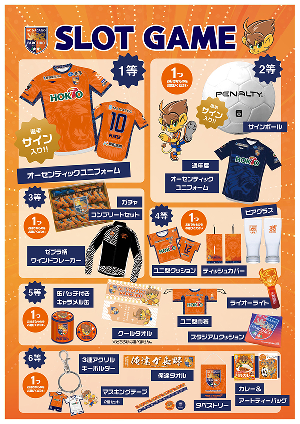 ・6等:新3連アクリルキーホルダー / 新パルセイロオリジナルマスキングテープ2個入 / 新選手タペストリー / パルカレー&アートティーバッグセット / 俺達が長野タオルマフラー / 千尋の谷タオルマフラー