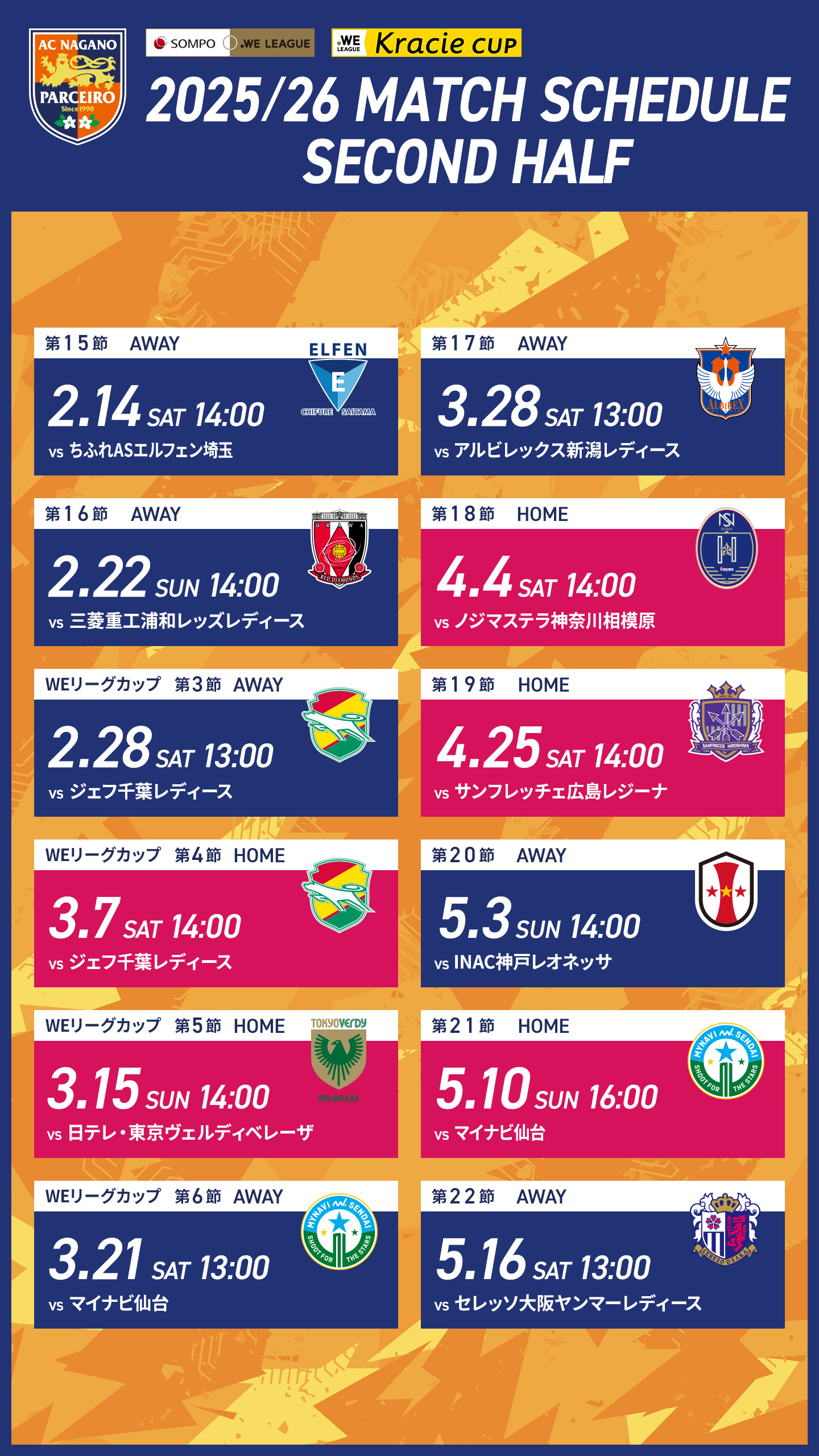 【PDF版はこちら】2025/26 SOMPO WEリーグ第15節~第22節、2025/26 WEリーグカップグループステージ 第3節~第6節 対戦カード