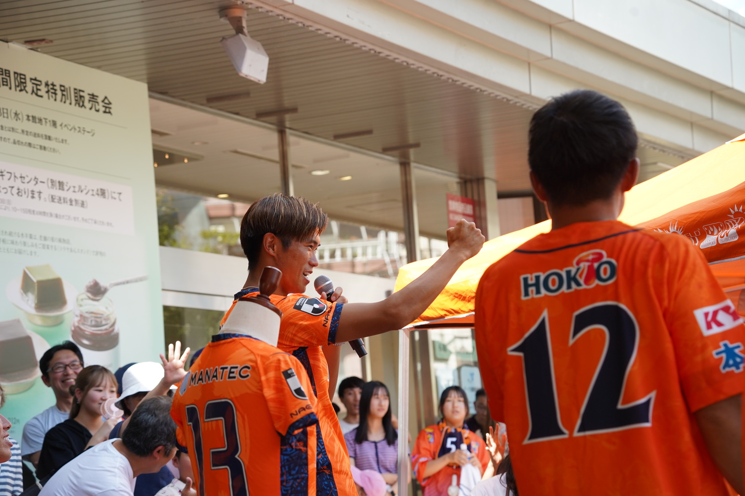 トークショーは、クラブOBの大橋良隆さんをMCに迎え、長谷川 雄志選手・大野 佑哉選手によるトークショーを開催。ここまでのシーズンの振り返りや、ダービーにかける熱い想いを語っていただきました。会場には多くの方が集まり、トークショーをお楽しみいただきました。また、ながの東急百貨店正面スペースにはライオーふわふわランドを設置。小さなお子さま連れのご家族にも楽しんでいただき、幅広い世代の方々にクラブを身近に感じていただける機会となりました。さらに、クラブスタッフによるチラシのハンディング(配布)も実施。多くの通行中のお客様にお声がけし、7月19日のダービー開催をお知らせしました。
