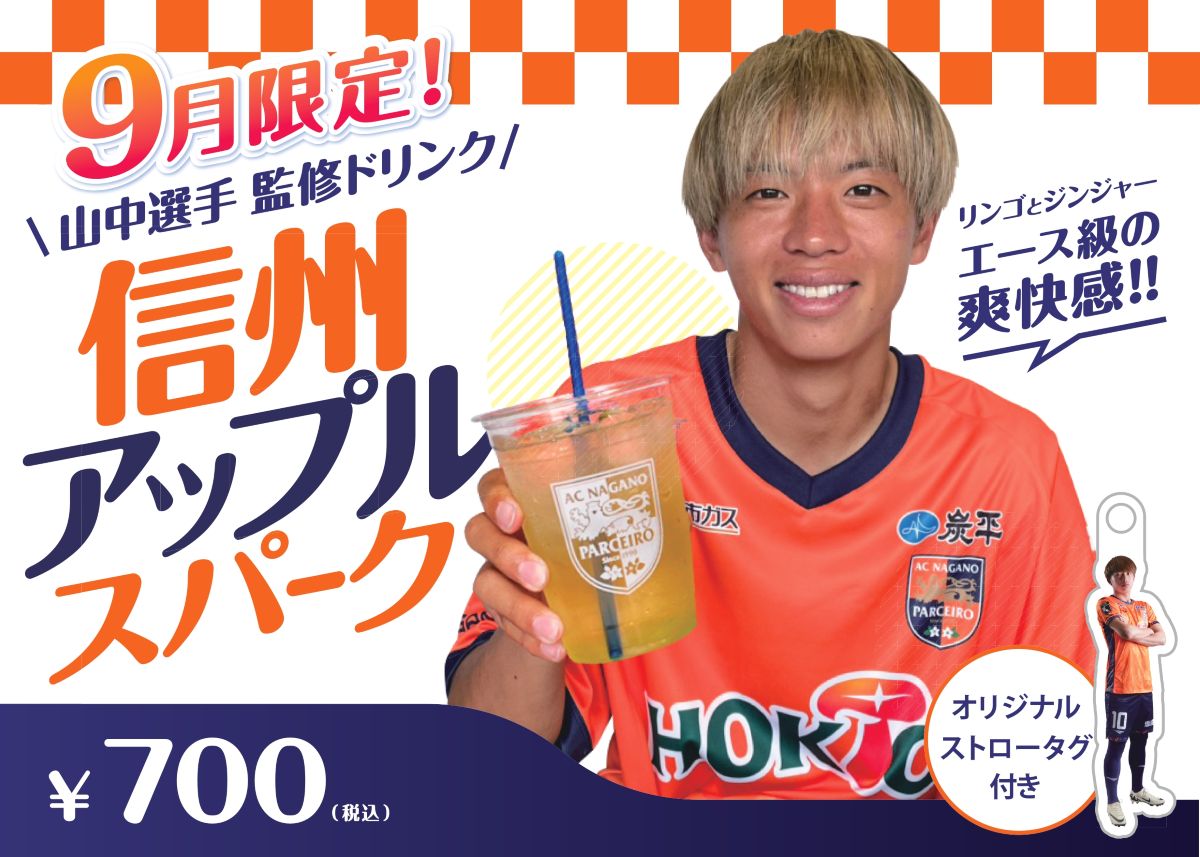 9月の選手監修メニューは、背番号10 山中麗央選手が考案した【信州アップルスパーク】が登場!リンゴの爽やかな甘さとジンジャーのピリッとした刺激が絶妙にマッチし、まだまだ暑さの残る季節にぴったりの一杯です。そして、ドリンクをご購入いただいた方には、オリジナルストロータグが付いてきます!スタジアムでしか味わえない、山中選手のこだわりがギュッと詰まった特別なドリンクを、ぜひご堪能ください!