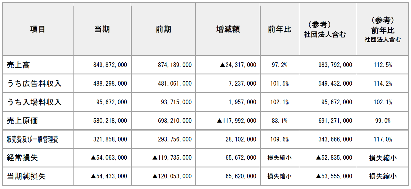 売上高は849,871,613円(前期比24,317,173円減)となりました。このうち広告料収入は488,298,118円(同7,236,850円増)、入場料収入は95,672,290円(同1,957,592円増)でした。一方で、経常損失は54,062,736円、当期純損失は54,432,870円となりましたが、いずれも前期比では損失幅が縮小しております。