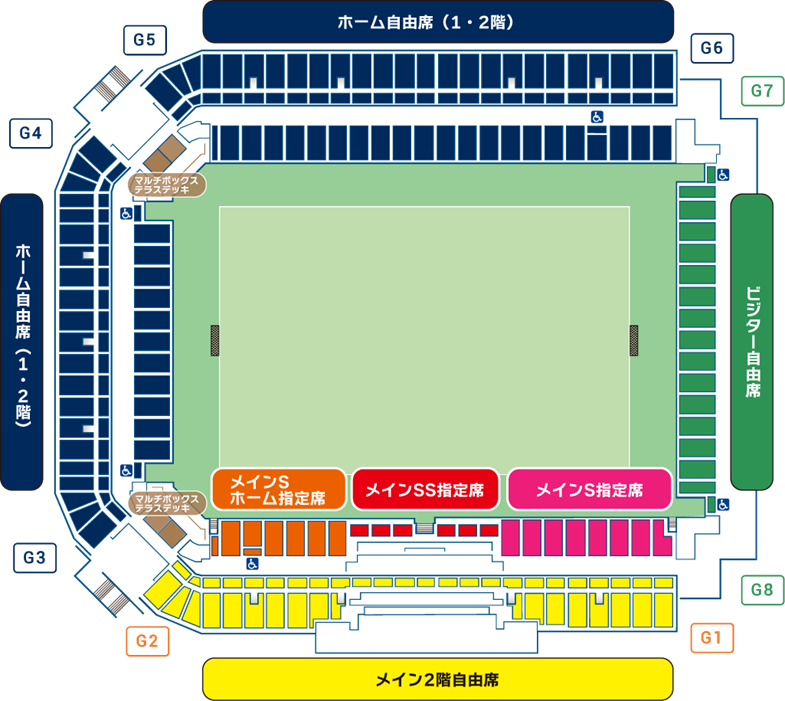 ・メインスタンド指定席、自由席はホーム・アウェイ両チームそれぞれのユニフォームやグッズ等を身に着けての応援・観戦が可能です。