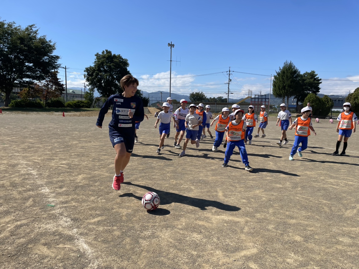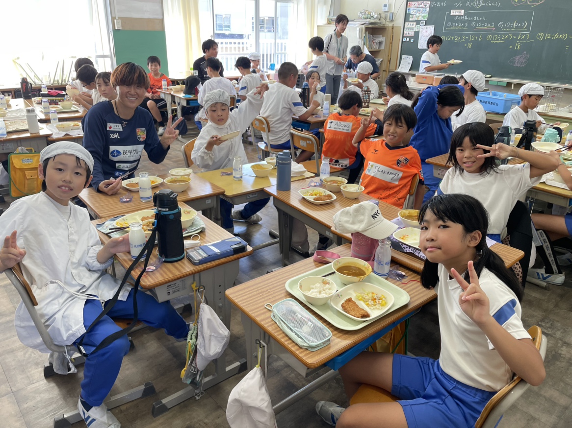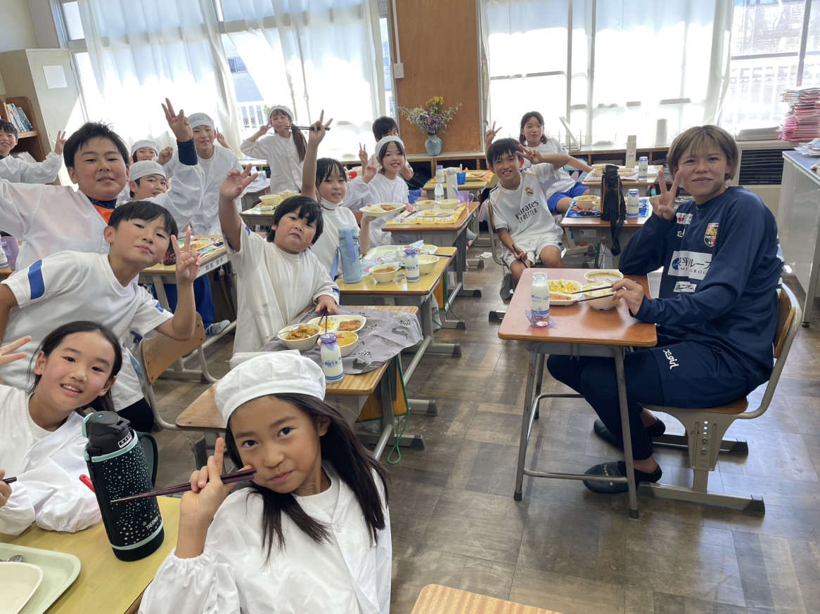 また応援献立と合わせて、ホームスタジアムである長野Uスタジアムのお膝元、篠ノ井東小学校4年生の皆さんと、梅村真央選手、岩下胡桃選手、川船暁海選手がサッカー交流を行い、給食を一緒にいただきました。