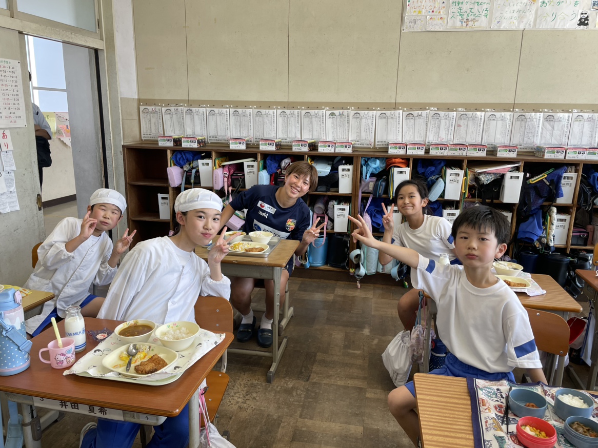 子どもたちはとても元気で、選手たちも笑顔いっぱいの時間を過ごしました。選手たちは「なつかしい〜!」「おいしい!」「みんな食べるの早いね!」と話しながら、楽しく交流しました。