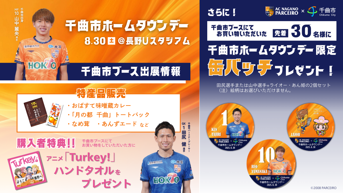 千曲市物産展で商品をご購入いただいた方全員に「Turkey!」ハンドタオルをプレゼント!また、先着30名様にホームタウンパートナープレーヤーの田尻選手、山中選手の限定缶バッチをプレゼント!皆様ぜひお早めに!