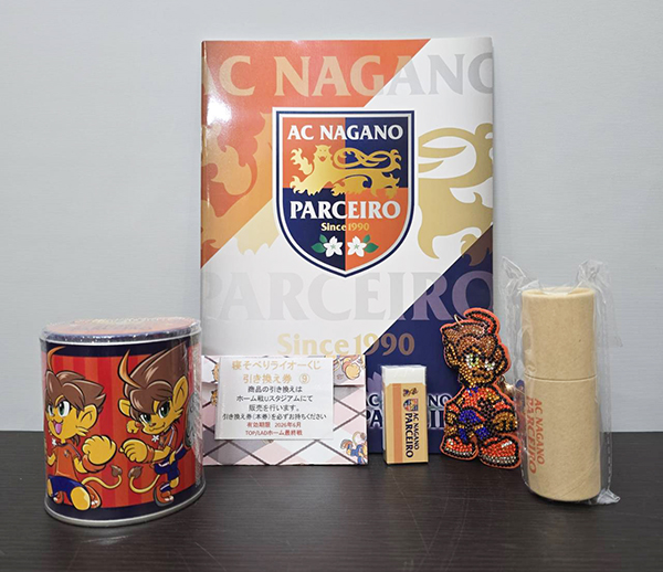 パルセイロオリジナル文具セットやキャラメル缶キーホルダーの他、スタジアムで大人気の「ねそべりライオーくじ」が引ける引換券が入った大変お得な福袋をご用意しました。
