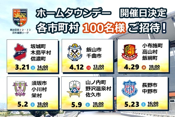 AC長野パルセイロでは、ホームタウン16市町村の一人でも多くの方に、おらが街のクラブとしてより身近に感じ、生きがいの一つになれるよう、各市町村の「ホームタウンデー」を開催しています。