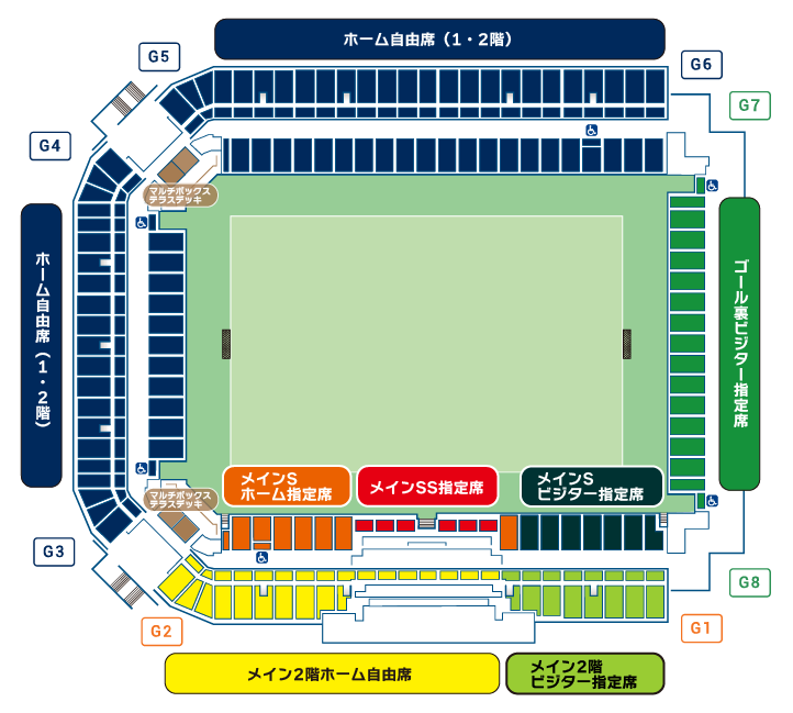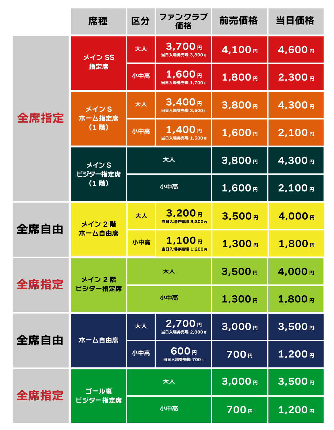 メイン2階自由席は、「メイン2階ホーム自由席」に席種名称が変更となります。また、メイン2階ビジター指定席での観戦はできません。