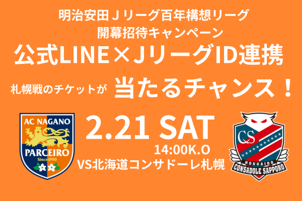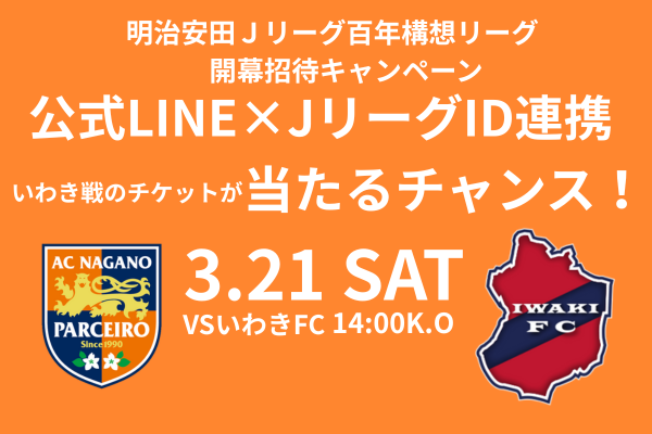 Jリーグでは、2026シーズン開幕期に「明治安田Jリーグ百年構想リーグ」招待キャンペーンを実施いたします。AC長野パルセイロでは、下記2試合が本キャンペーンの対象試合となります。まだスタジアムにご来場されたことのない方や、久しぶりに観戦しようとお考えの方も、この機会にぜひスタジアムへお越しください。 皆さまのご来場を心よりお待ちしております