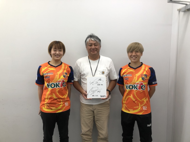 信濃毎日新聞株式会社様:マーケティング局 地域スポーツ担当部長 安川 次郎様/クラブ訪問者:髙野瀬 紫苑選手、筬島 彩佳選手