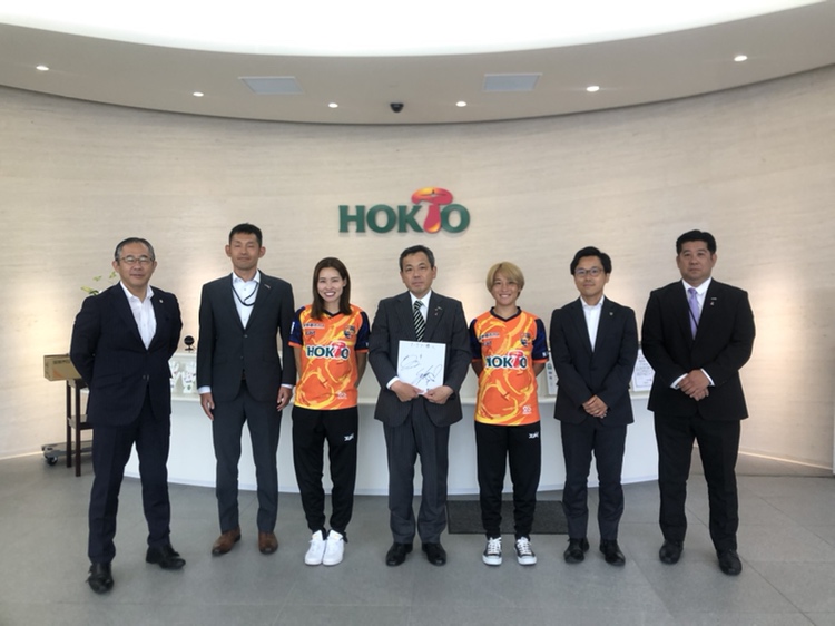 ホクト株式会社 様:代表取締役社長 水野雅義 様、執行役員 総務部 部長 宮原 慎吾 様/クラブ訪問者:澁谷社長、市原統括長、稲村雪乃選手、三谷沙也加選手