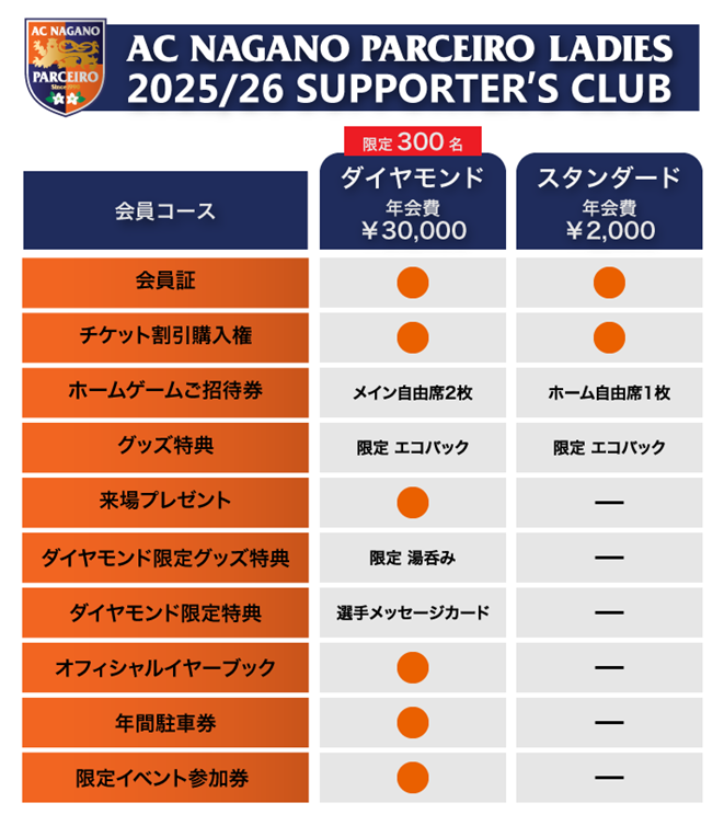 AC長野パルセイロのオフィシャルファンクラブであるサポーターズクラブは、入会者限定の多くの特典をラインナップ!グッズやチケット購入を通じてより楽しく、よりお得に試合をご観戦いただけます。