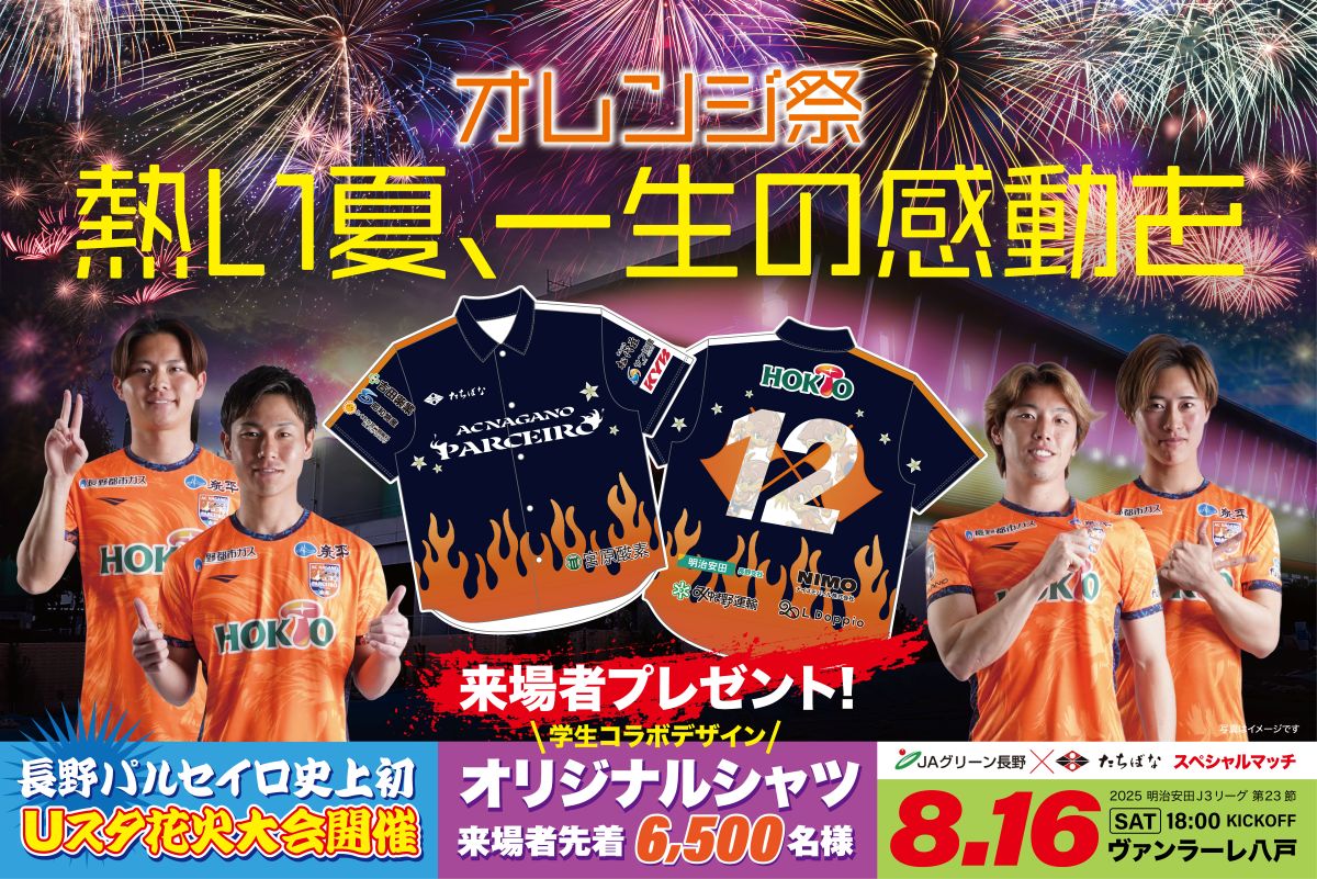 8月16日(土)ヴァンラーレ八戸戦は「オレンジ祭」開催!当日は、襟付きシャツの来場者プレゼントに加え、パルセイロ史上初!長野Uスタ花火大会を実施! スタジアムが歓喜と感動のオレンジに染まる、特別な一夜をお届けします。家族と、友人と、この熱い夏の思い出を、AC長野パルセイロと一緒に作ろう。皆さまのご来場を心よりお待ちしております!