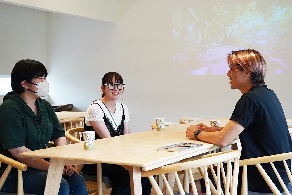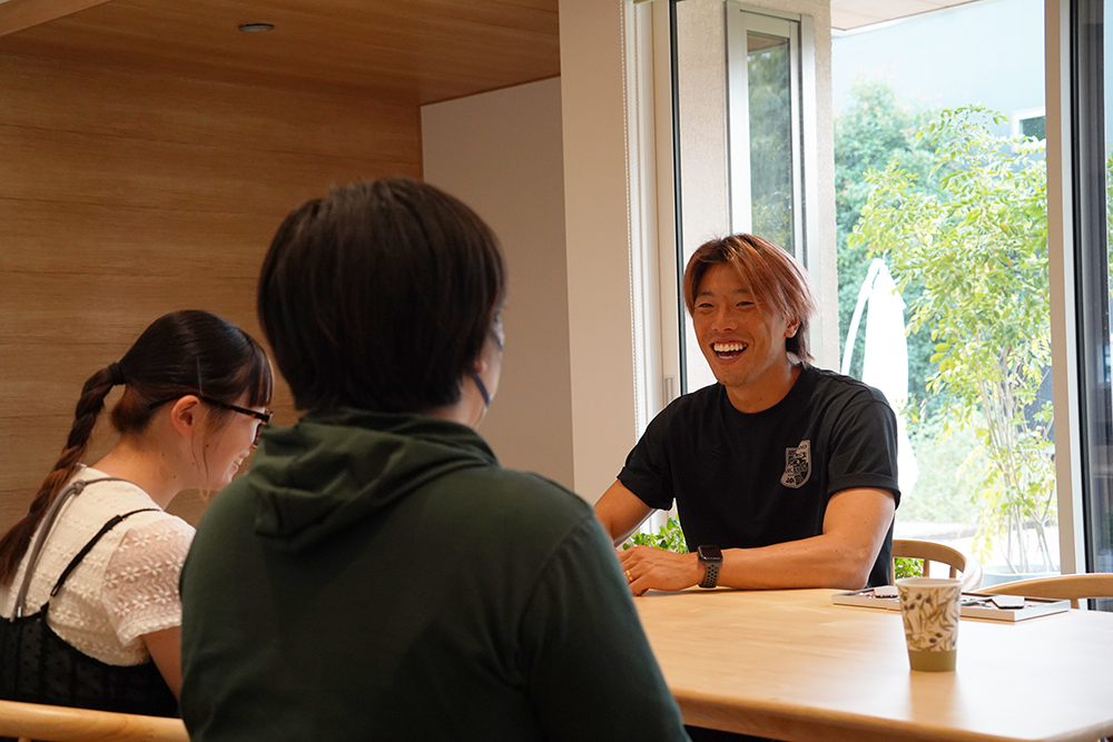 今回の告知モデルを担当した長谷川選手と、選ばれたデザインを担当した学生を訪問。和やかな雰囲気の中、長谷川選手から学生の皆さまに対し、デザインに込めた想いや選ばれた時の気持ち、実際に配布を行った際の感想を伺いました。また、普段の学校生活や将来について、話をする場面も。